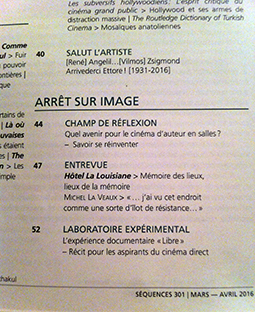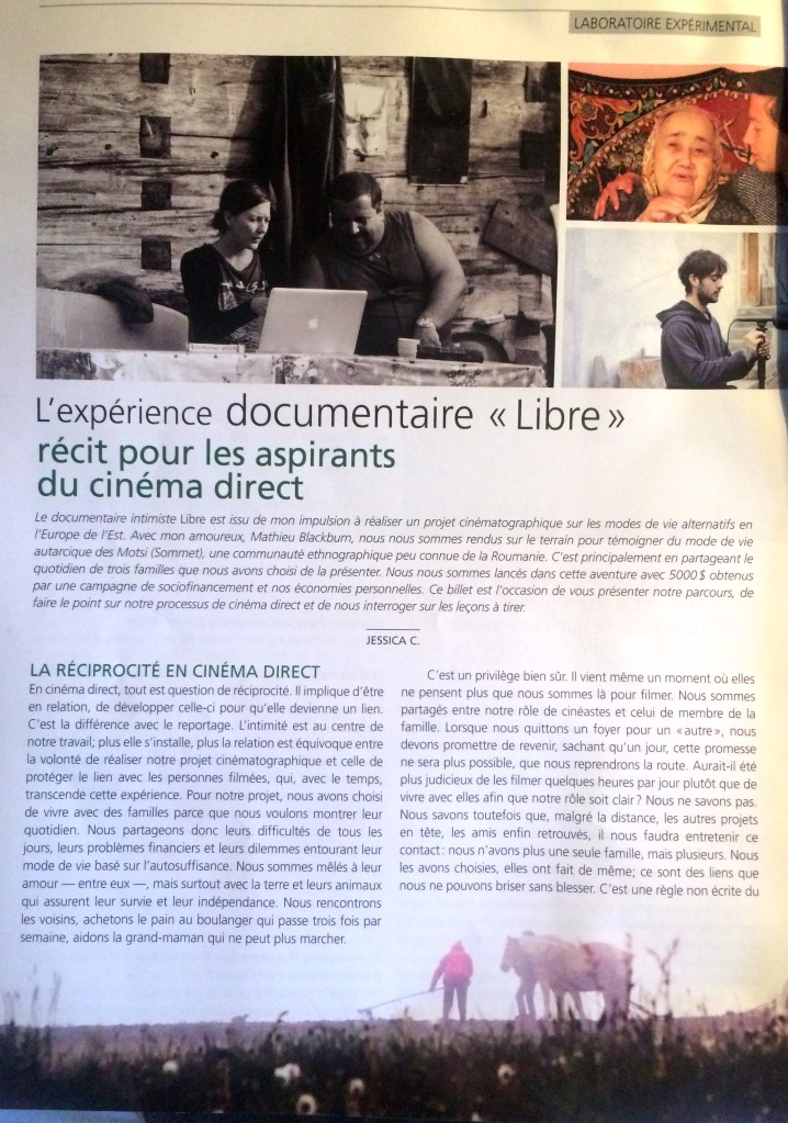 L'expérience documentaire Libre Récit de tournage du documentaire « Libre » réalisé en duo en Roumanie. Revue Séquences, numéro 301, mars-avril 2016, p.52 à 55.